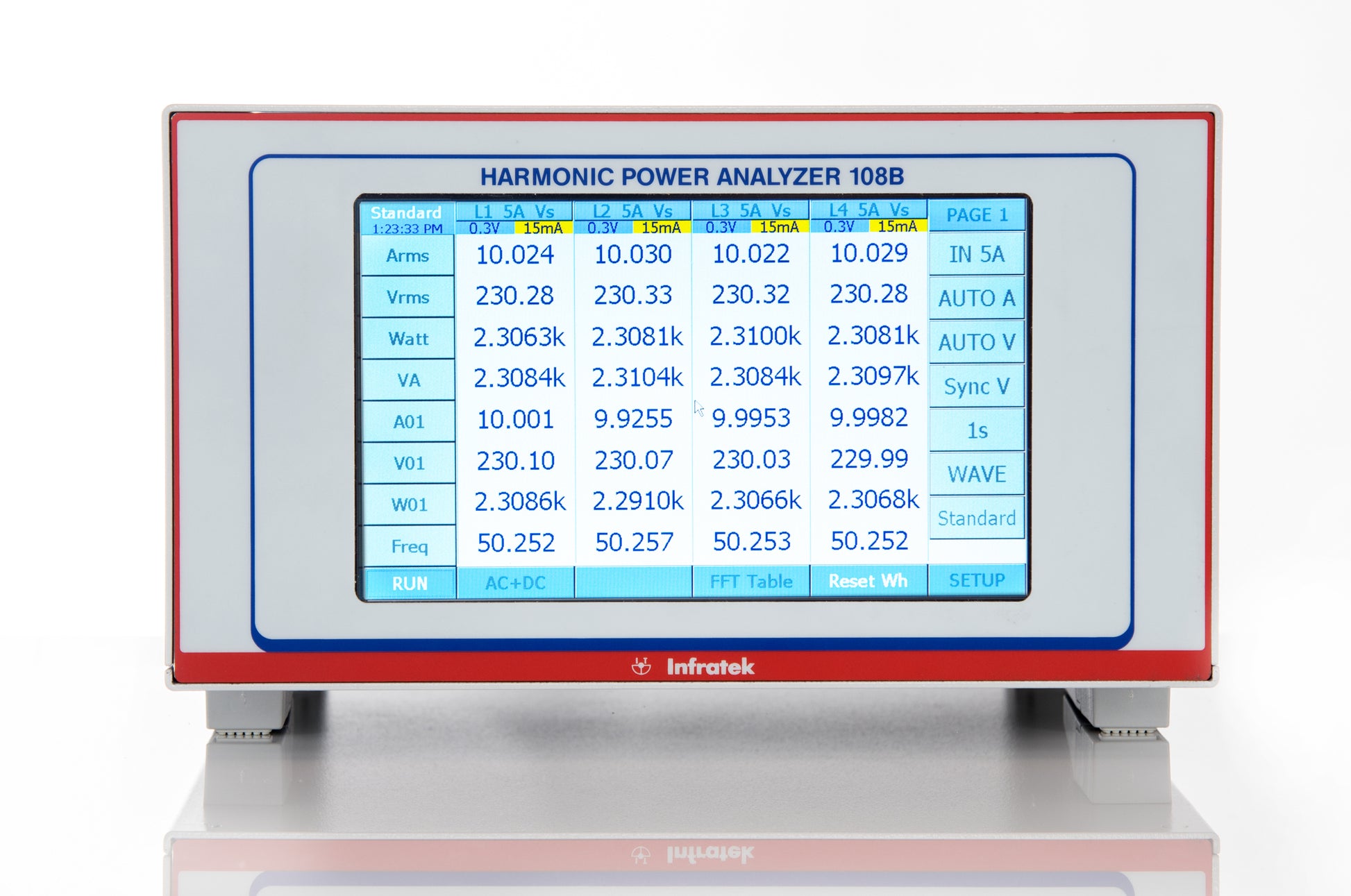 The Infratek 108B-3 is a high-end, Swiss-engineered three-phase power analyzer built for professionals in R&D, manufacturing, and power system testing. It is equipped with a responsive touchscreen, advanced measurement architecture, and four powerful measurement modes.
