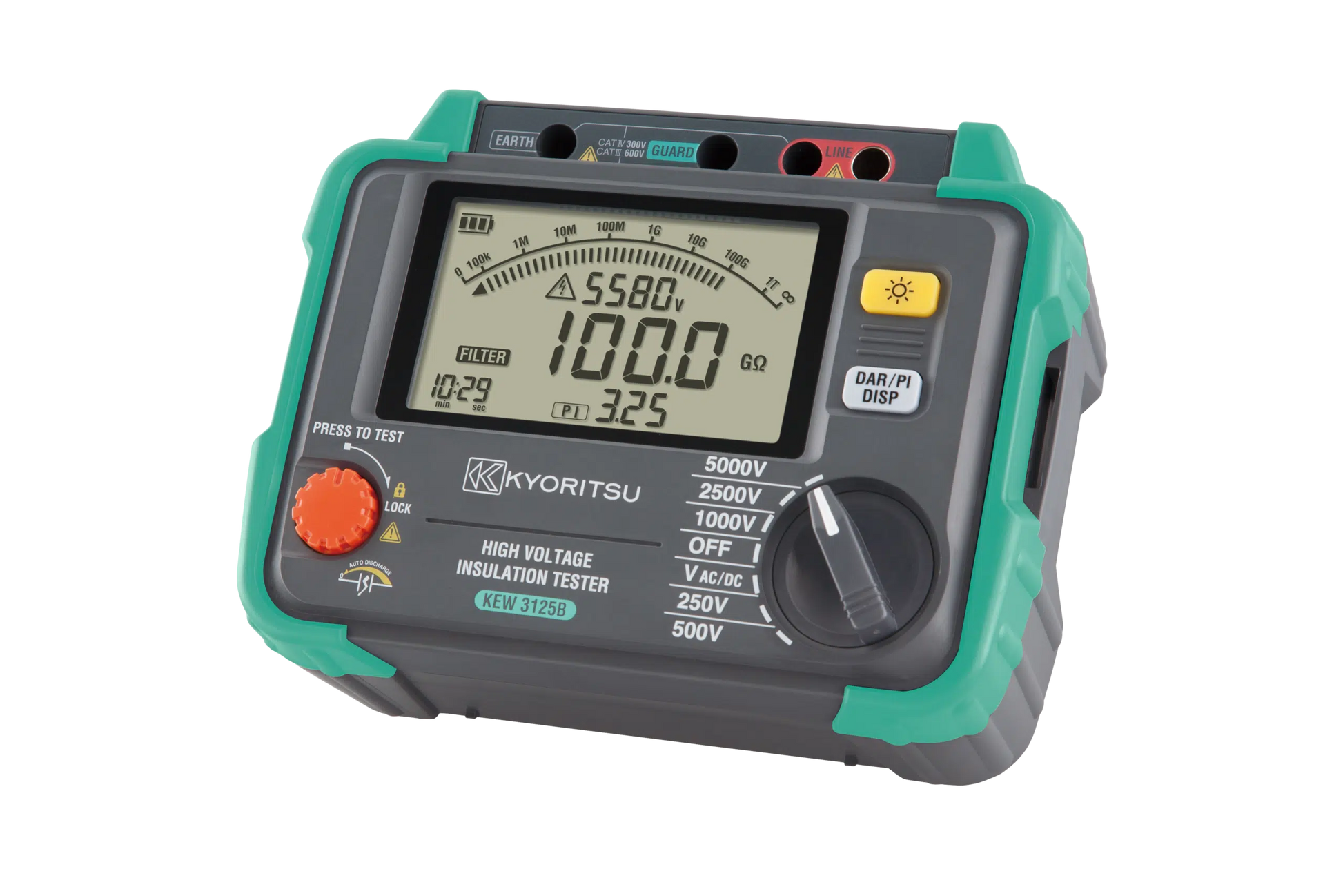 The KEW 3125B is a digital high-voltage insulation tester designed for demanding industrial and utility applications. With test voltages up to 5000 V and insulation resistance measurement up to 1 TΩ, it delivers the accuracy and safety professionals need when working with large motors, switchgear, cables, and transformers.